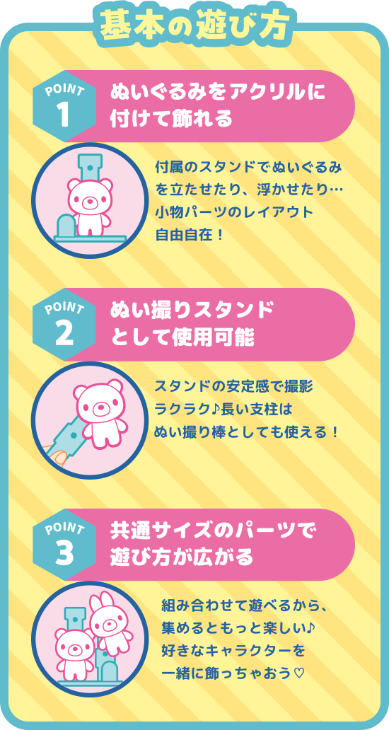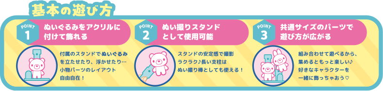 基本の遊び方 POINT1 マスコットをアクリルに付けて飾れる 付属のスタンドでマスコットを立たせたり、浮かせたり・・・小物パーツのレイアウト自由自在 POINT2 ぬい撮りスタンドとして使用可能 スタンドの安定感で撮影ラクラク♪長い支柱はぬい撮りとしても使える! POINT3 共通サイズのパーツで遊び方が広がる 組み合わせて遊べるから、集めるともっと楽しい♪好きなキャラクターを一緒に飾っちゃおう♡
